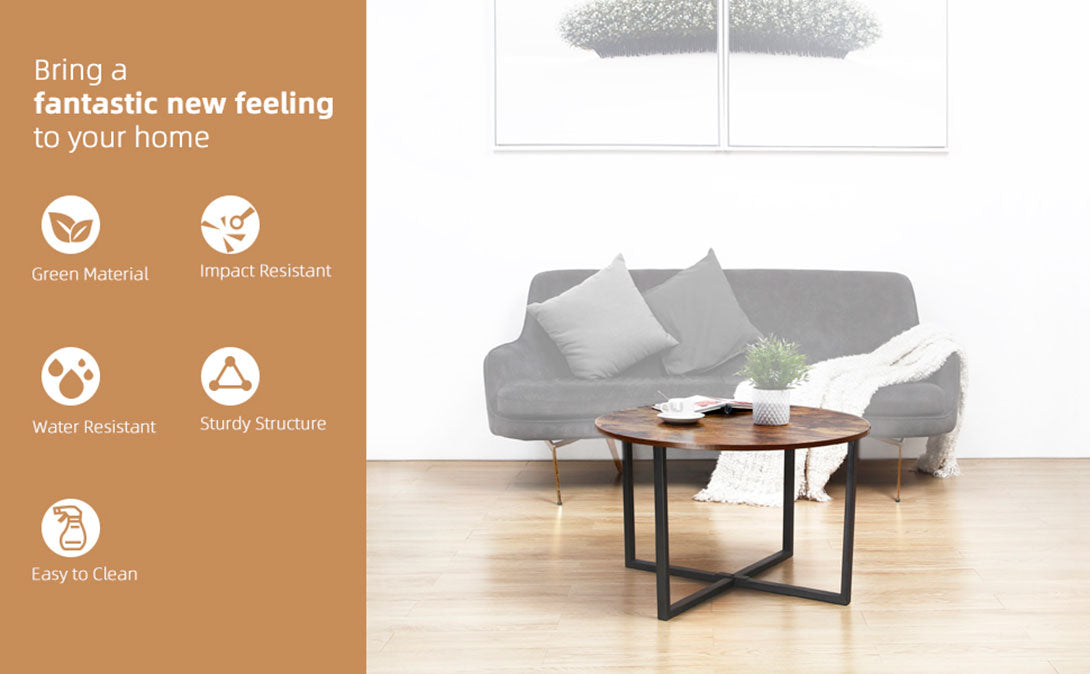 Round coffee table top made of 15mm Eco-friendly P2 particles with perfect edge technology, green non-toxic materials, and waterproof lining. The strong "X" metal frame base ensures durability and stability, resulting in longer use life and never shaking. The table is easy to clean and supports up to 100Ibs.